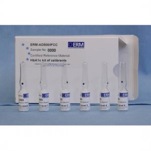 ERM-AD500/IFCC HbA1c 校準(zhǔn)試劑盒由一組安瓿,包含約30μL的緩沖溶液(50 mmol/L 2-嗎啉乙醇磺酸(MES),10 mmol/L氰化.鉀,1 mmol/L 乙二胺四乙酸(EDTA),pH 6.2)的血紅蛋白。每個(gè)安瓿中含有約1毫克的血紅蛋白。