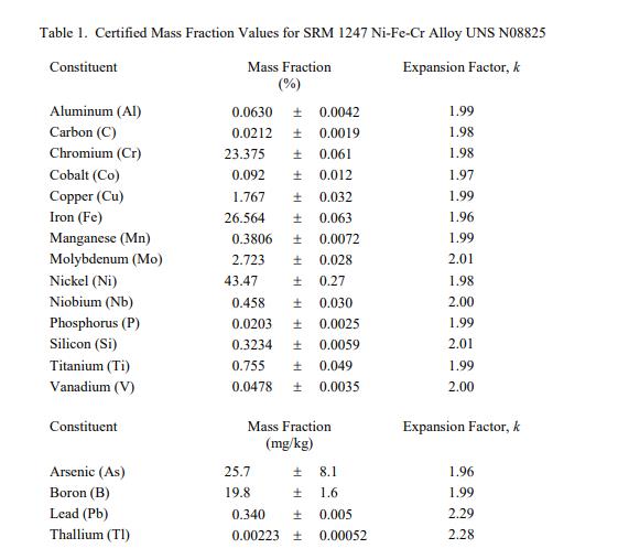 參考質(zhì)量分?jǐn)?shù)值在表 2 中給出。參考值是未經(jīng)認(rèn)證的值,是當(dāng)前對真實值的最佳估計;但是,這些值不符合 NIST 的認(rèn)證標(biāo)準(zhǔn) [2],并且提供了相關(guān)的不確定性,這些不確定性可能僅反映測量精度,可能不包括所有不確定性來源,或者可能反映多種分析方法之間缺乏足夠的一致性。