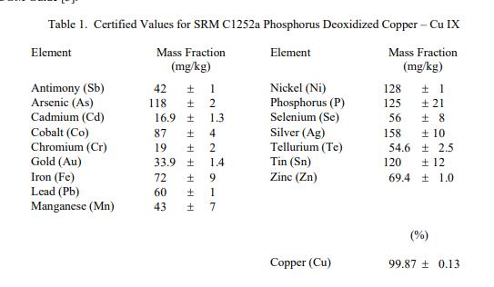 NIST SRM C1252a 磷脫氧銅–CuIX(標(biāo)準(zhǔn)品)主要用于評估化學(xué)分析方法和校準(zhǔn)用于分析銅及其合金的儀器方法。 SRM C1252a 的一個單元由一個定向凝固的冷鑄塊組成,大約 32 毫米見方和 19 毫米厚。
