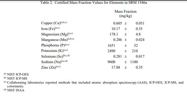 表 1 至表 3 提供了 SRM 1546a 中膽固醇、元素和維生素的認證質量分數值(按原樣報告)。 NIST 認證值是 NIST 具有最高置信度的值在其準確性方面,所有已知或可疑的偏見來源都已被考慮到[1]。價值分配分析由 NIST 和合作實驗室進行。認證值計算為 NIST 方法的平均值和合作實驗室提供的結果平均值的中位數或平均值(如果適用)。相關的不確定性以 95% 的置信水平表示 [2-4]。