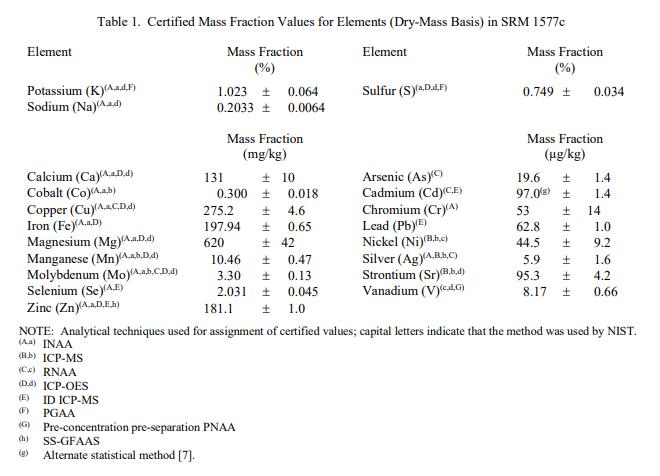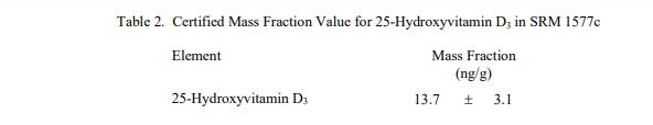 表 1 中提供了元素的認(rèn)證質(zhì)量分?jǐn)?shù)值。表 2 中提供了 25-羥基維生素. D3 的認(rèn)證質(zhì)量分?jǐn)?shù)值。元素的認(rèn)證值基于所執(zhí)行的主要分析技術(shù)的結(jié)果在 NIST 或在 NIST 和合作專家實(shí)驗(yàn)室獲得的兩種或多種化學(xué)獨(dú)立分析技術(shù)的組合結(jié)果 [1]。 25-羥基維生素 .D3 的認(rèn)證值基于 NIST 和合作專家實(shí)驗(yàn)室的綜合結(jié)果。 NIST 認(rèn)證值是 NIST 對(duì)其準(zhǔn)確性具有最高置信度的值,因?yàn)樗幸阎蚩梢傻钠顏?lái)源都已被調(diào)查或考慮在內(nèi) [1]。
