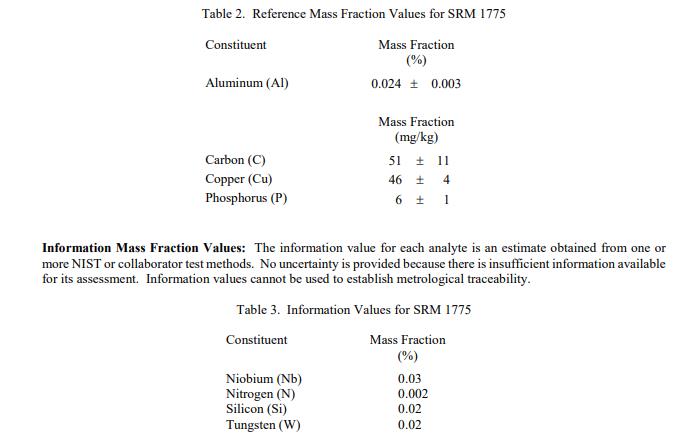 表 3 中提供了鈮、氮、硅和鎢的信息值。由于沒有足夠的信息來進行適當的統計評估,因此沒有報告這些值的不確定性。