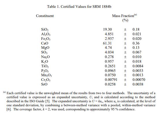 SRM 1884b 中 13 種成分的認(rèn)證值在表 1 中報(bào)告為收到時(shí)的質(zhì)量分?jǐn)?shù) [1]。 NIST 認(rèn)證值是 NIST 對(duì)其準(zhǔn)確性有最高置信度的值,因?yàn)樗幸阎蚩梢傻钠顏?lái)源都已被調(diào)查或考慮在內(nèi) [2]。認(rèn)證值是根據(jù) NIST 和合作實(shí)驗(yàn)室使用附錄 A 中列出的儀器和經(jīng)典測(cè)試方法進(jìn)行的分析結(jié)果對(duì)真實(shí)值的當(dāng)前最佳估計(jì)。