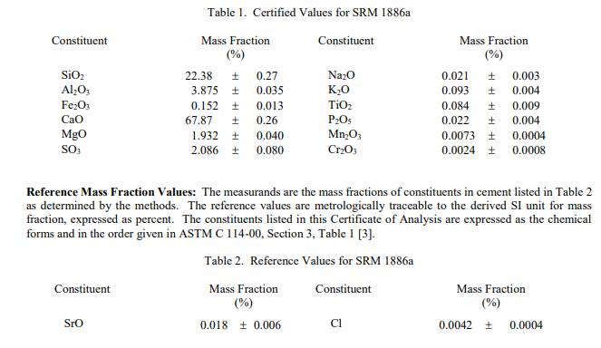表 1 提供了 SRM 1886a 的認(rèn)證值,以收到時(shí)的質(zhì)量分?jǐn)?shù) [1] 表示。NIST 認(rèn)證值是 NIST 對(duì)其準(zhǔn)確度有最高置信度的值,因?yàn)樗幸阎蚩梢傻钠妬碓炊家驯徽{(diào)查或考慮 [2]。這列出的認(rèn)證值基于 NIST、Construction Technology Laboratories(1), Inc. (CTL, Skokie, IL) 和美國地質(zhì)調(diào)查局 (USGS, Denver, CO) 使用 X 射線熒光光譜法進(jìn)行的分析結(jié)果,原子吸收分光光度法、電感耦合等離子體發(fā)射光譜法和 ASTM C 114-00 液壓水泥化學(xué)分析標(biāo)準(zhǔn)測(cè)試方法 [3] 中給出的參考方法。在 NIST 使用 X 射線熒光光譜法進(jìn)行均勻性測(cè)試。隨每個(gè)值列出的不確定性是擴(kuò)展的不確定性,覆蓋因子為 2,根據(jù) ISO/JCGM 指南 [5],通過將方法間方差 [4] 與匯總的方法內(nèi)方差相結(jié)合來計(jì)算。