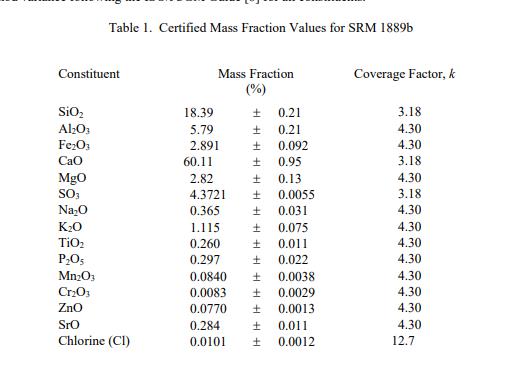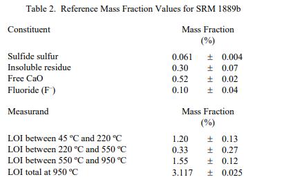 表 2 中報(bào)告了成分和燒失量 (LOI) 的參考值。NIST 參考值是未經(jīng)認(rèn)證的值,是基于可用數(shù)據(jù)對(duì)真實(shí)值的當(dāng)前最佳估計(jì);但是,該值不符合 NIST 認(rèn)證標(biāo)準(zhǔn),并提供了相關(guān)的可能僅反映測(cè)量重現(xiàn)性的不確定性,可能不包括所有不確定性來(lái)源,或可能反映多種分析方法之間缺乏足夠的統(tǒng)計(jì)一致性 [2]。