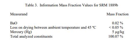 表 3 中報(bào)告了成分的信息值、環(huán)境溫度和 45 oC 之間的 LOI 以及總分析成分的信息值。信息值被認(rèn)為是 SRM 用戶可能感興趣的值,但沒有足夠的信息來(lái)評(píng)估與值相關(guān)的不確定性 [2]。信息值不能用于建立計(jì)量溯源性。