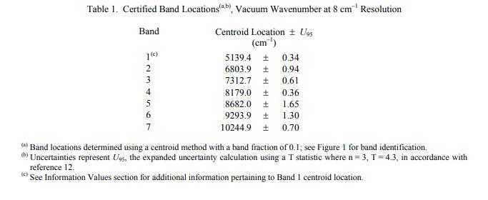 表 1 列出了 7 個反射吸收波段的認證真空波數位置,范圍從 10 300 cm-1 到 5 130 cm-1。7 個 NIR 空氣波長波段位置的認證值表 2 列出了從 976 nm 到 1946 nm 的反射吸收波段。 NIST 認證值是 NIST 對其準確性有最高置信度的值,因為所有已知或可疑的偏差來源都已被充分調查或考慮在內[1]。