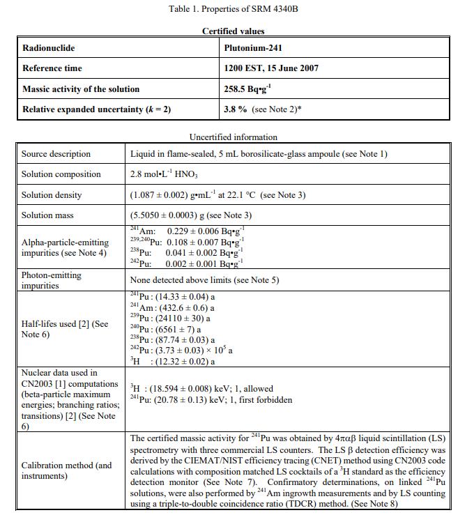 NIST SRM 4340B 钚 241 放射性標準 由經過標準化和認證數量的放射性钚 241 在適當穩定和均質的基質中的溶液組成。它主要用于校準用于測量放射性和監測放射化學程序的儀器。該溶液的成分列于表 1,裝在一個火焰密封的 5 mL 硼硅酸鹽玻璃安瓿中(見注 1)*。