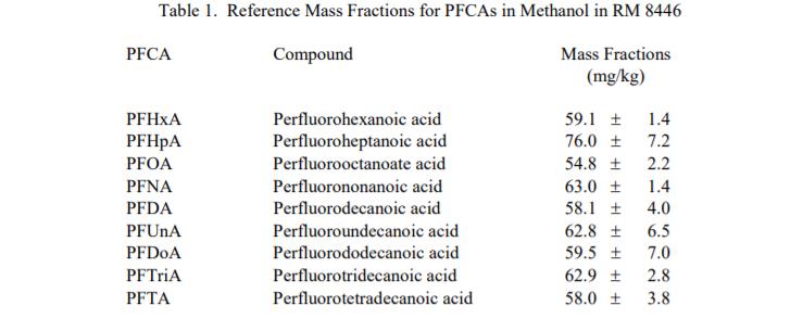 PFCA 和 PFOSA 的參考質量分數:表 1 中給出了參考質量分數值甲醇中的 PFCA 和表 2 中甲醇中的 PFCA 和 PFOSA。這些值基于從溶液的重量法制備獲得的結果和使用液相色譜法確定的分析結果。參考值是對真實值的最佳估計的非認證值;但是,這些值不符合 NIST 認證標準,并且提供了可能反映的相關不確定性僅測量精度,可能不包括所有不確定性來源,或者可能反映多種分析方法之間缺乏足夠的統計一致性 [1]。