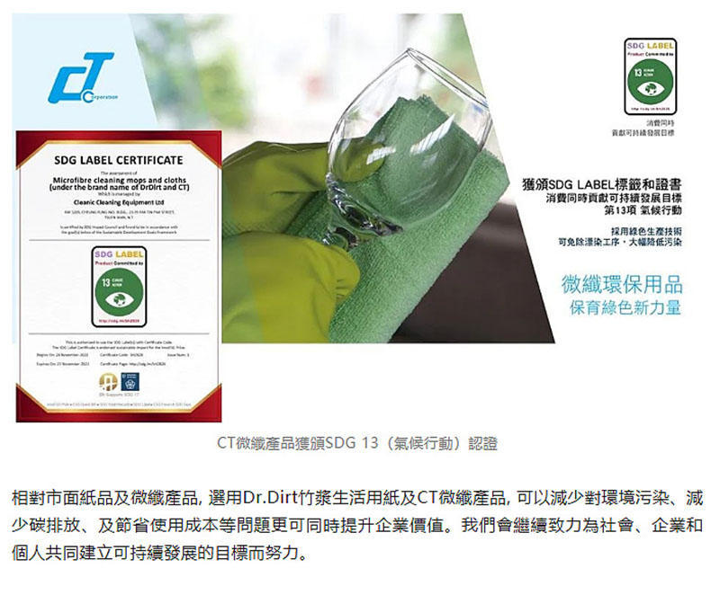 健力集團(tuán)已于2023年獲得SDG 12項(xiàng) 及SDG 13項(xiàng)環(huán)保認(rèn)證。施達(dá)公司作為健力集團(tuán)的一份子,與集團(tuán)同心協(xié)力,不遺余力地推動(dòng)清潔行業(yè)的ESG理念完善及探索實(shí)踐,為可持續(xù)發(fā)展做出新貢獻(xiàn)。