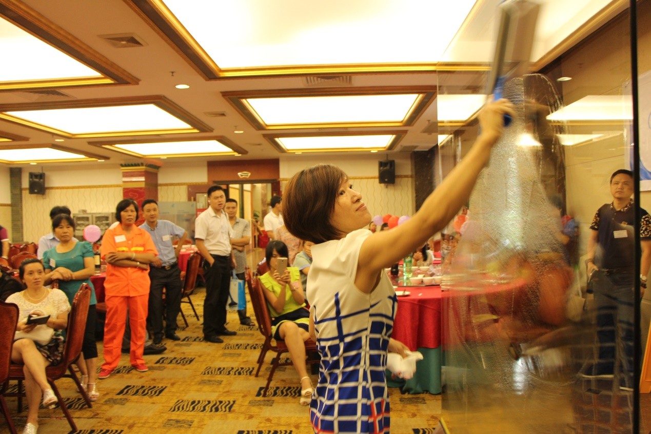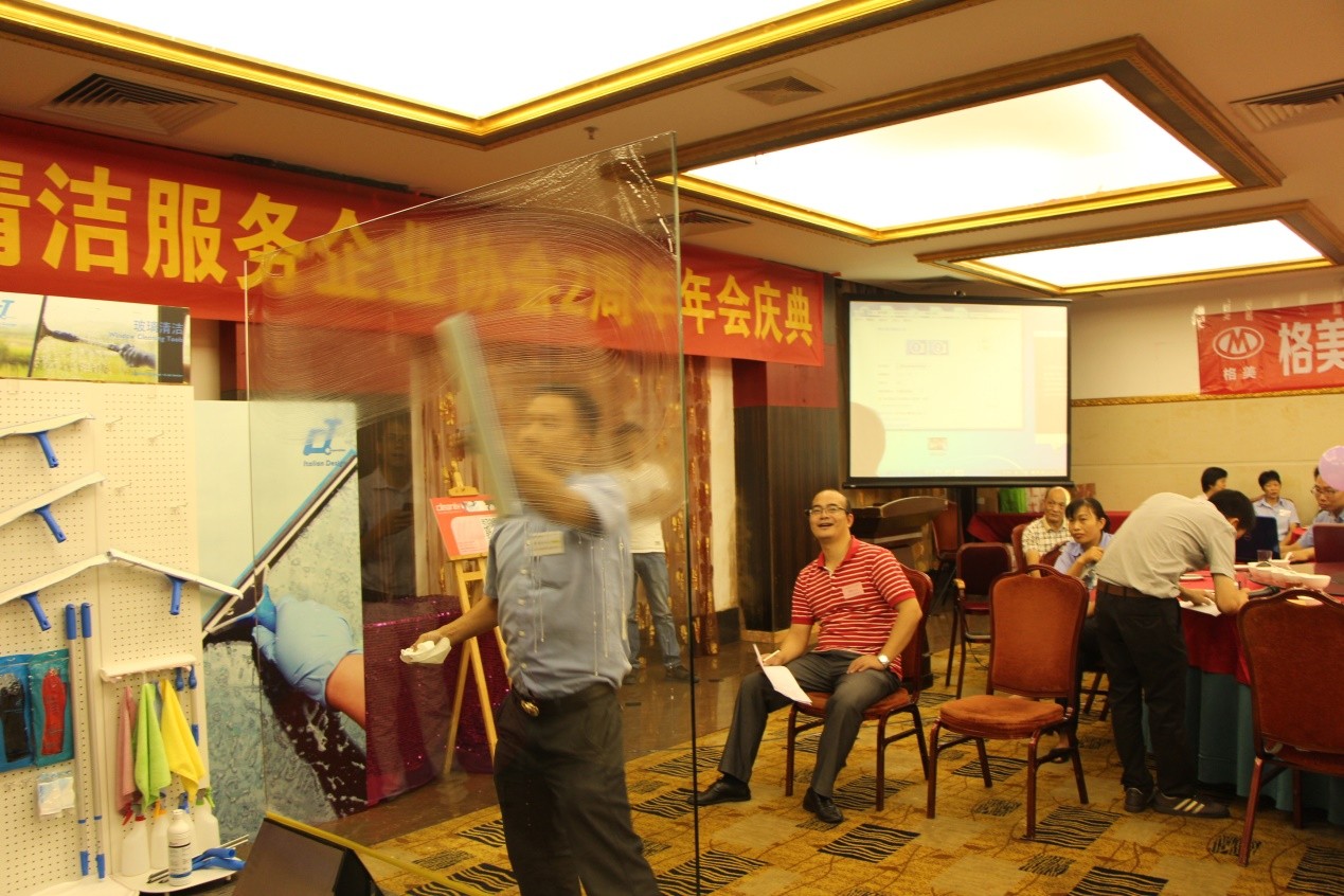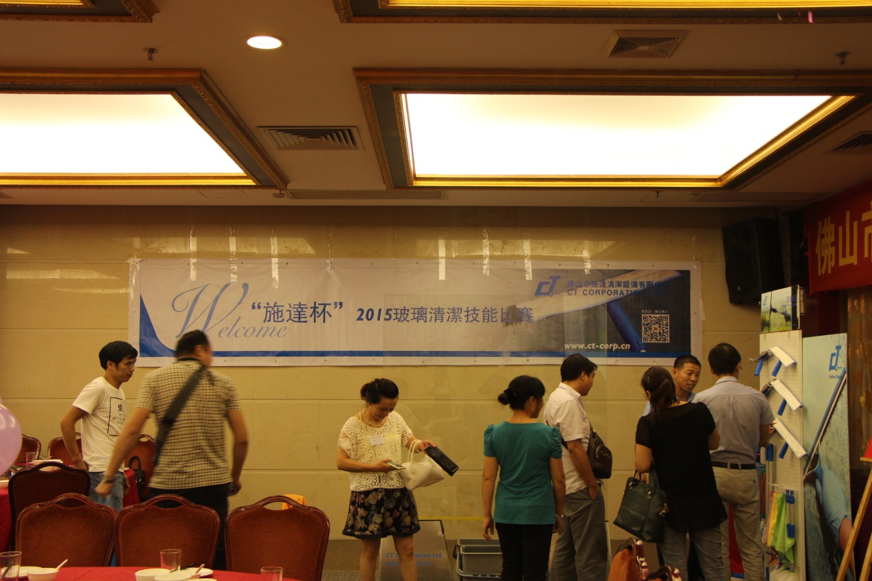 由佛山市清潔服務企業協會聯合佛山施達冠名舉辦的‘施達杯’玻璃清潔技能大賽于2015.8.28舉行,佛山地區十多家資深清潔企業派遣行業精英參與競技,比賽現場競爭激烈,其中以CT施達最新專利刮窗神器: 2合1雙面玻璃刮為主要的比賽工具,經一番精彩角逐比拼, 最終產生前三優秀選手。