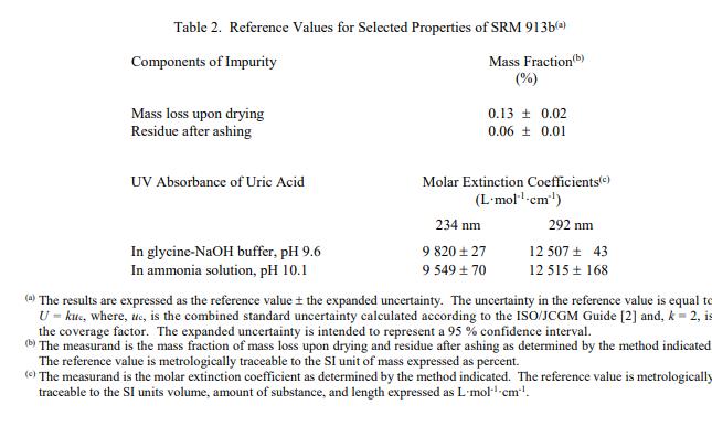 分析方法:認證值和參考值的所有分析均在 NIST 進行。由于尿酸不熔化,差示掃描量熱法不能用作純度的總體測量。相反,使用多種技術評估潛在雜質,包括:液相色譜-質譜 (LC-MS)、氣相色譜-質譜 (GC-MS)、干燥失重、800 °C 灰化和紫外線 (紫外)光譜。干燥和灰化分析的結果如表 2 所示。可能存在其他低含量雜質,但此處使用的技術未檢測到。認證純度是通過從 100% 中減去干燥后的質量損失和灰化后的殘留物之和來確定的。